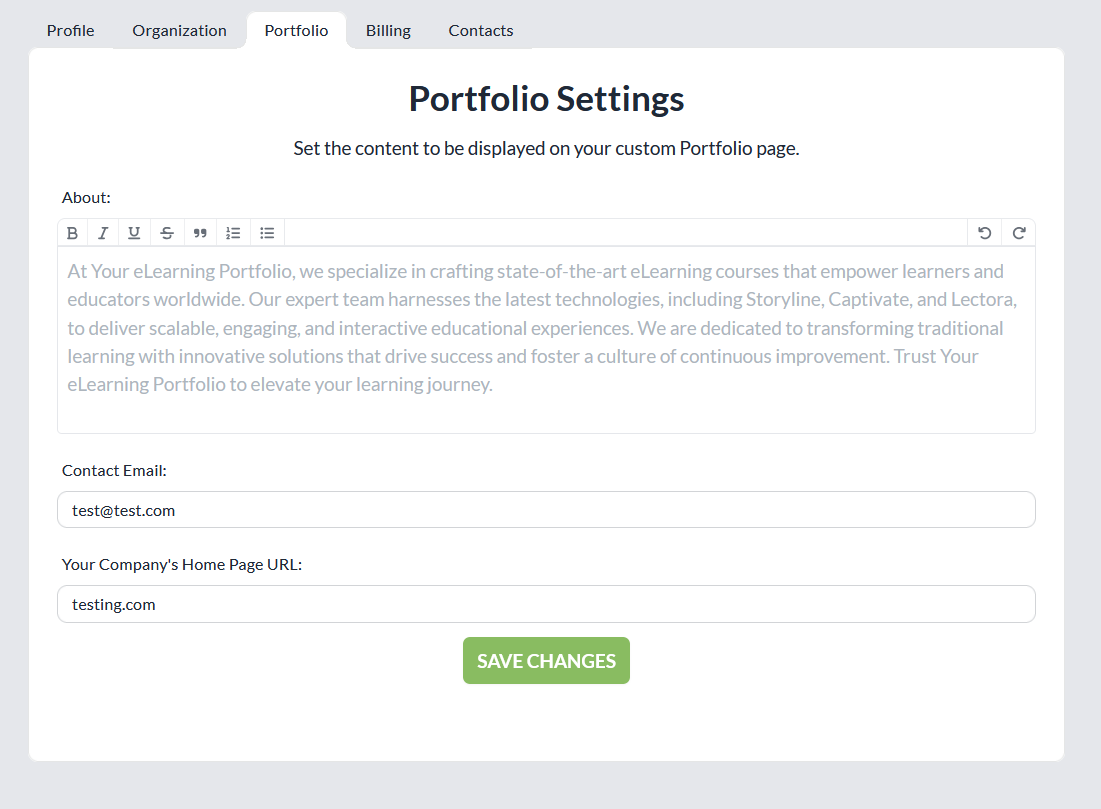 Here, you can insert an About for you and your work, your contact email, and a link to redirect clients to your homepage.