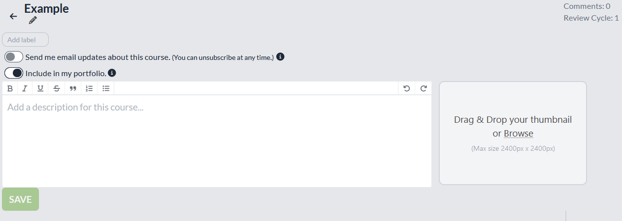 Adding courses to your Portfolio is easy. Navigate to your favorite, most polished course that you have owned and uploaded into Review My eLearning, using your Courses dashboard. Click the toggle “Include in my portfolio.” to display the course on your portfolio, with the option to add a description and a thumbnail.
