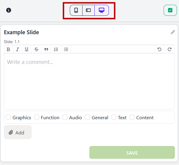 Reviewers can drag the divider between the course and form to change the size ratio for each element, but the form will take up some space on the screen. Reviewers can also use the buttons at the top of the form to select different preset player sizes which match mobile landscape, mobile portrait, and standard monitor sizes.