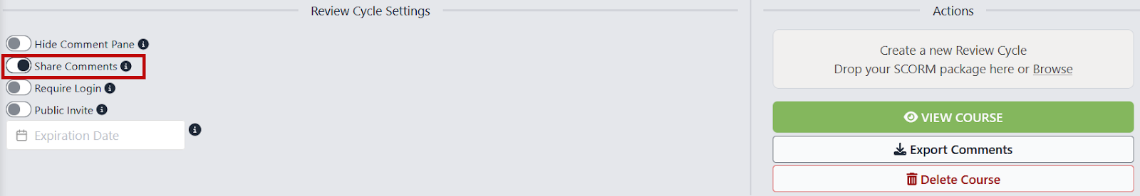Developers and Uploaders for a course can always see all comments on that course. For each review cycle, you can choose if Reviewers can see each other's comments. This toggle can be found on the Details page of any given course, located under “Review Cycle Settings.”